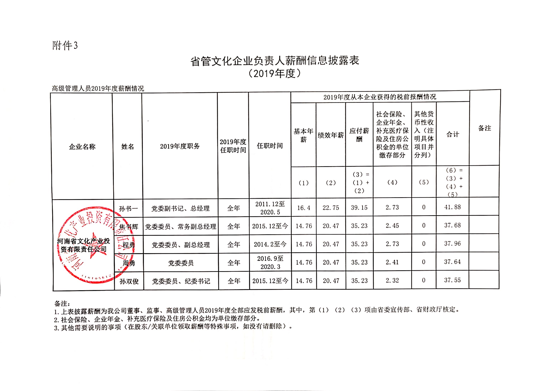 省管企业负责人年度薪酬信息披露表 (河南省文投公司2020年度)